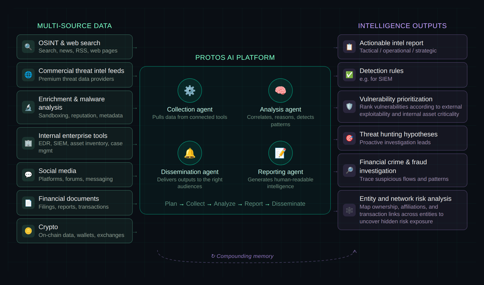 Protos AI is the intelligence layer for investigation teams. Our AI agents investigate across every place adversaries operate — your enterprise systems, the open web, social media, and the dark corners of the internet — then translate what they find into what it means for your organisation. Not enriched indicators. Conclusions your team can act on.
